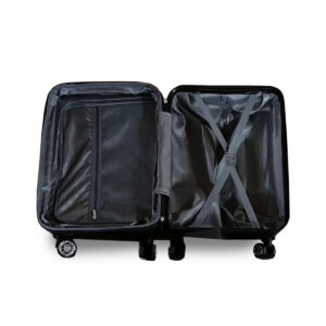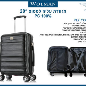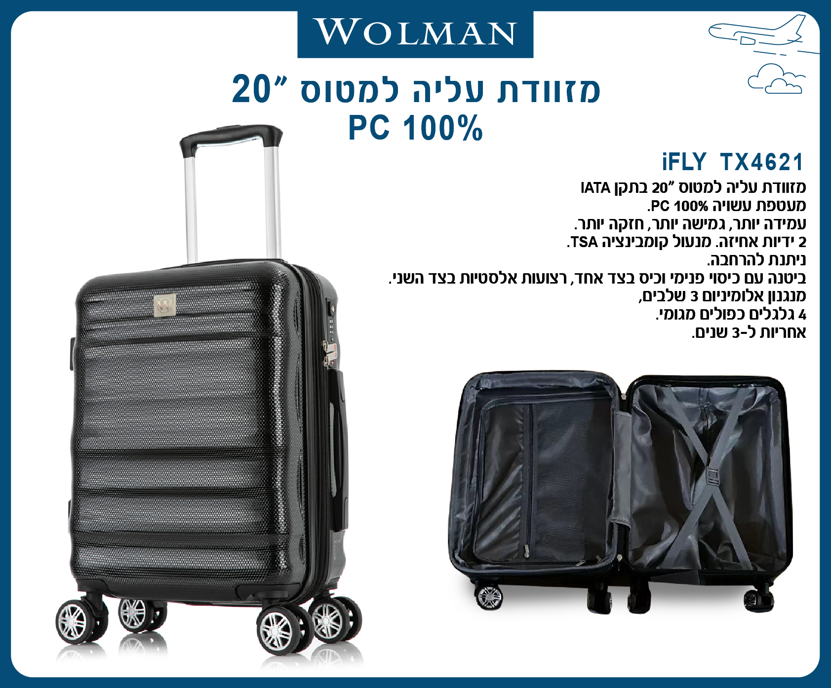 מזוודת עליה למטוס מעטפת 100% PC מזוודה מתרחבת תקן IATA 4 גלגלים כפולים עם גומי 360 מעלות מנעול TSA שתי ידיות אחיזה ביטנה פנימית עם כיס בצד אחד ורצועות הידוק בצד השני מנגנון 3 שלבים מאלומיניום אחריות ל-3 שנים