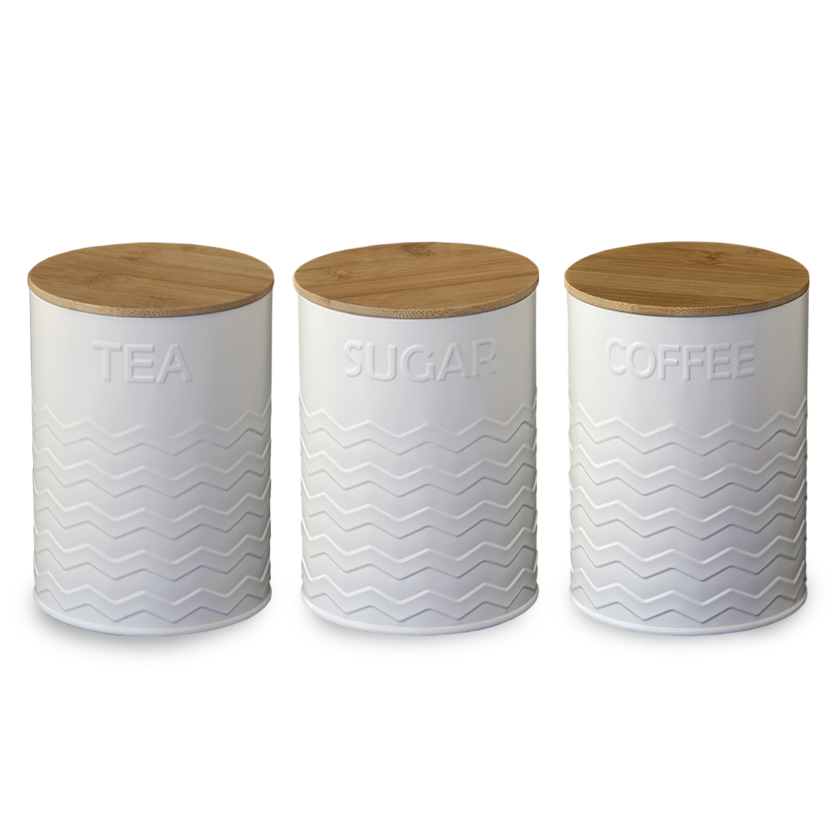 סט שלוש קופסאות מתכת עבה - תה, קפה, סוכר ציפוי פנימי מתאים למזון. מכסה במבוק עם סגירת סיליקון למניעת לחות. אריזת מתנה. מידות המוצר: 15* 11Ø ס"מ