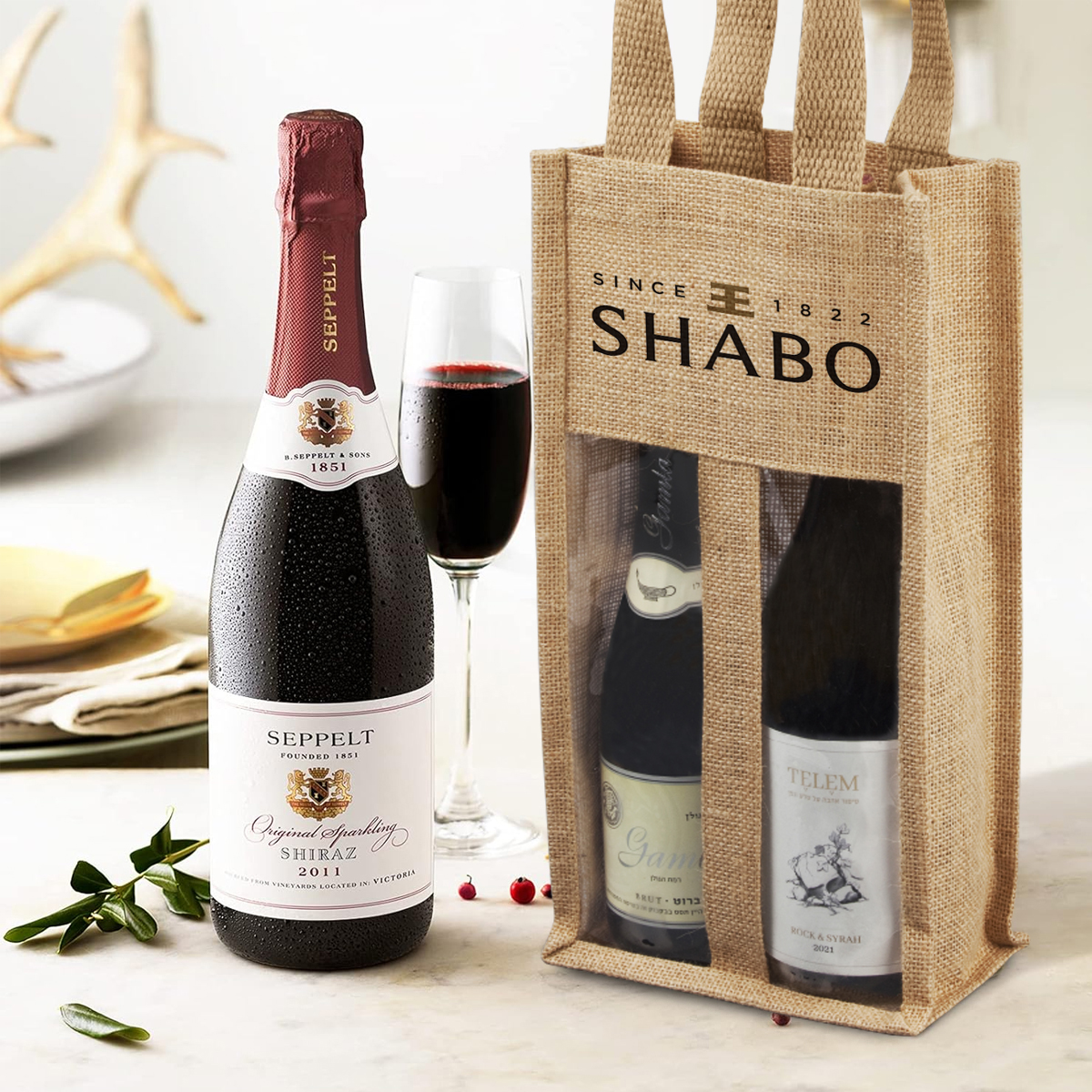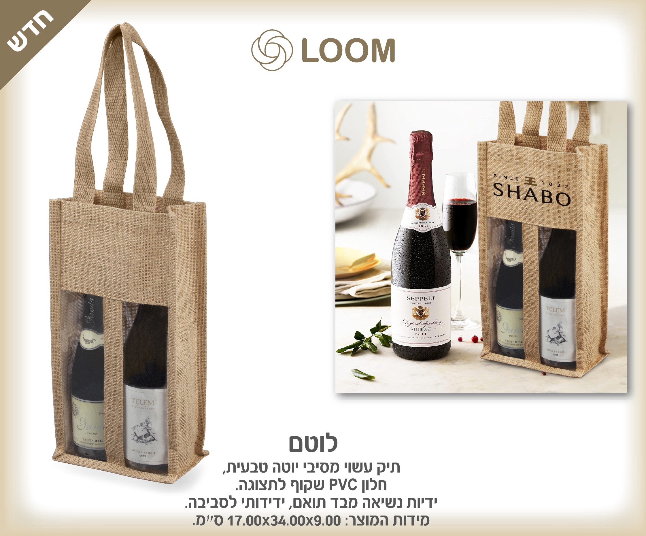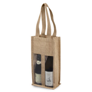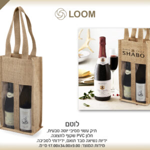 תיק יוטה לבקבוקי יין, לנשיאה ביד. מתאים לאריזת מתנות, תיק עשוי מסיבי יוטה טבעית, חלון PVC  שקוף לתצוגה ידיות נשיאה מבד תואם, ידידותי לסביבה. מידות : 9.00*34.00*17.00 ס"מ