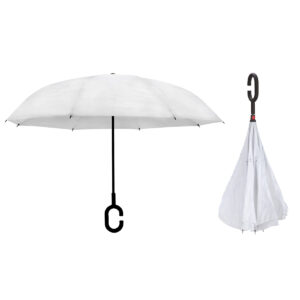 מטריה הפוכה "24 מוט פיברגלס, ידית אחיזה מפלסטיק. צלעות פיברגלס. פתיחה וסגירה ידנית. בפתיחה 107 ס"מ  קוטר מנגנון פיברגלס עמיד לרוחות חזקות. תפירה כפולה של הצלעות. מטריה הפוכה שניתן להיכנס בנוחות לרכב או להעמידה על הרצפה.